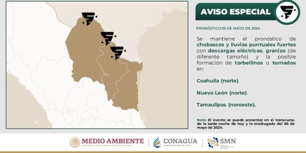 SE ESPERAN CHUBASCOS Y LLUVIAS PUNTUALES FUERTES, ADEMÁS DE LA PROBABILIDAD DE TORBELLINOS O TORNADOS EN COAHUILA