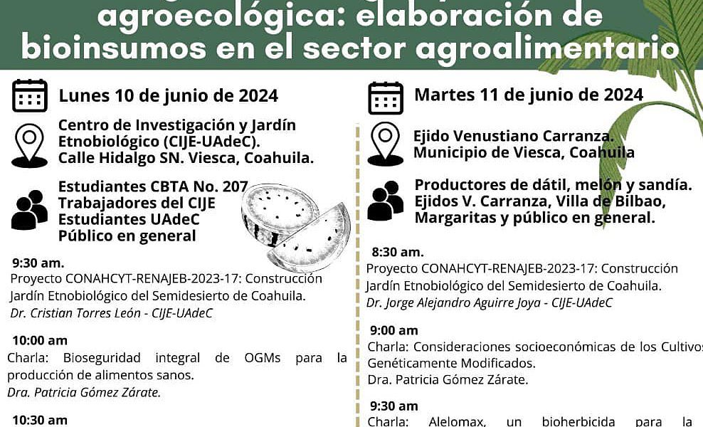 7 Junio 2024; Viesca, Coahuila.- La Universidad Autónoma de Coahuila, a través del Centro de Investigación y Jardín Etnobiológico (CIJE), en colaboración con la Secretaría Ejecutiva de la Comisión Intersecretarial de la Bioseguridad de los Organismos Genéticamente Modificados (CIBIOGEM), invita a los Talleres “Bioseguridad integral y transición agroecológica: Elaboración de bioinsumos en el sector agroalimentario” el próximo 10 y 11 de junio de 2024 en Viesca, Coahuila.