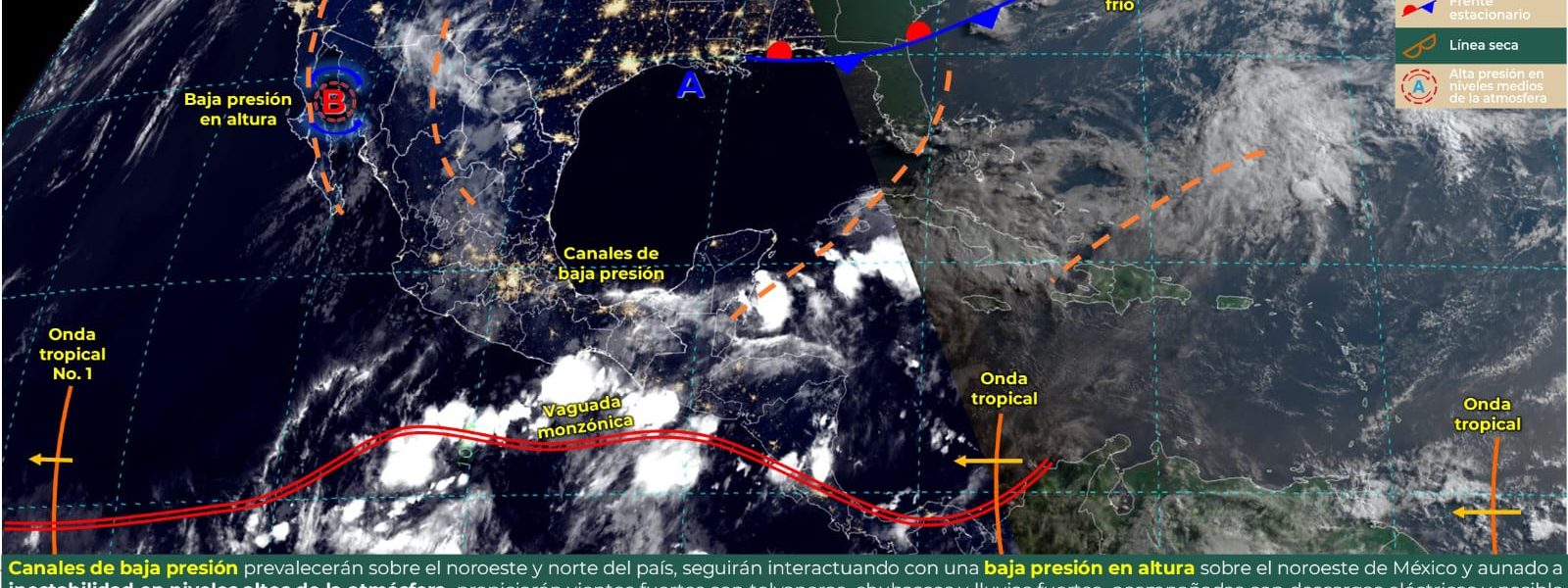 Se prevén temperaturas máximas que oscilarán entre 40 y 45 °C en el estado, con intervalos de chubascos y lluvias puntuales fuertes que podrían acumular de 25 a 50 mm, además de rachas de viento de 50 a 70 km/h con la posibilidad de formación de torbellinos.