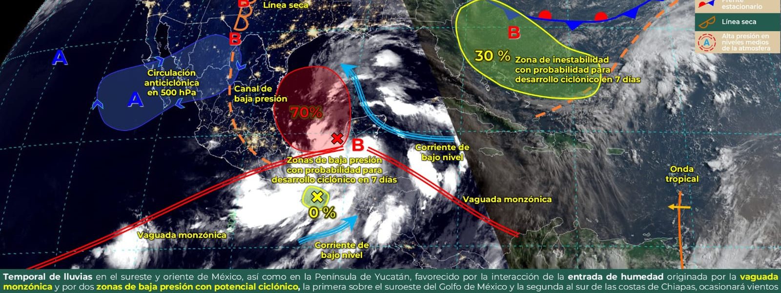 Según datos del Servicio Meteorológico Nacional, a partir del miércoles y hasta el domingo 23 de junio, se esperan lluvias intensas con puntuales torrenciales que pudieran acumular de 150 a 250 mm de agua, así como viento con rachas de 50 a 70 km/h y posibles tolvaneras. De igual manera, se esperan temperaturas superiores a los 40°C.