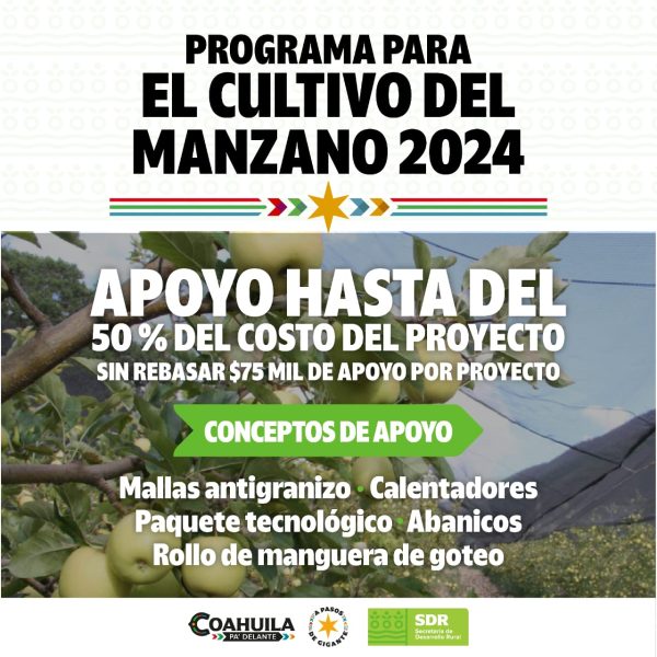 18 Junio 2024; Saltillo, Coahuila.- Con un apoyo hasta del 50 por ciento para proyectos que incluyen mallas antigranizo, calentadores, paquetes tecnológicos, rollos de manguera de goteo y abanicos, el Gobierno de Coahuila implementó el Programa para el Cultivo de Manzana 2024.