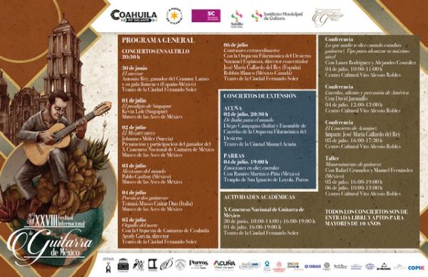 La Secretaria Esther Quintana recordó que “Se presentará en Saltillo 7 conciertos; en Parras de la Fuente y en Ciudad Acuña, uno en cada una de ellas; también se tendrán 11 Clases Magistrales; 2 Talleres de Mantenimiento de Guitarra y 2 Conferencias, que permitirán al público y a los estudiosos de guitarra clásica tener un acercamiento con esta maravillosa manifestación artística”.