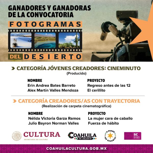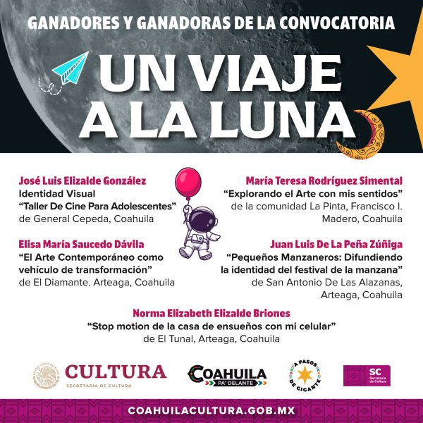 12 Julio 2024; Saltillo, Coahuila.- Para respaldar la creación artística y el desarrollo cultural en la entidad, en coordinación con el organismo Apoyo a Instituciones Estatales de Cultura (AIEC) de la Secretaría federal del ramo, el Gobierno de Coahuila anunció a las y los ganadores de las Convocatorias Fotogramas del Desierto y Un Viaje a la Luna.