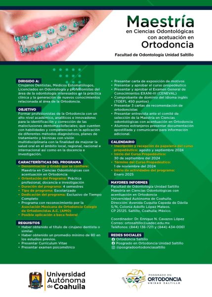 16 Julio 2024; Saltillo, Coahuila.- A Cirujanos Dentistas, Médicos Estomatólogos, Licenciados en Odontología y profesionistas del área de la Odontología interesados en la práctica clínica y la generación de nuevos conocimientos relacionada con el área de la Ortodoncia, se les invita a cursar la Maestría en Ciencias Odontológicas con Acentuación en Ortodoncia que ofrece la Facultad de Odontología Unidad Saltillo de la Universidad Autónoma de Coahuila y cuyas clases iniciarán en enero de 2025.