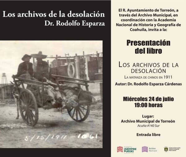 La presentación del libro: “Los archivos de la desolación. La matanza de chinos en 1911”, se realizará a las 19:00 horas, en el recinto municipal, ubicado en la calle Acuña 140 colonia Centro, con entrada libre.
