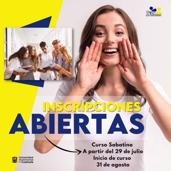 25 Julio 2024; Torreón, Coahuila.- El Centro de Idiomas Unidad Torreón de la Universidad Autónoma de Coahuila, llevará a cabo inscripciones del 29 de julio al 30 de agosto para los cursos de lunes a viernes y sabatinos de inglés, alemán, francés e italiano, que darán inicio el próximo 19 y 31 de agosto respectivamente.