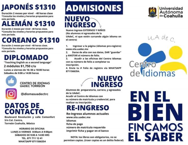 Para más información, llamar al teléfono (871) 711 12 41, escribir Facebook @CENTRODEIDIOMASUADECTORREON, en Instagram @idiomasuadectrc y vía WhatsApp: (871)156 63 54.