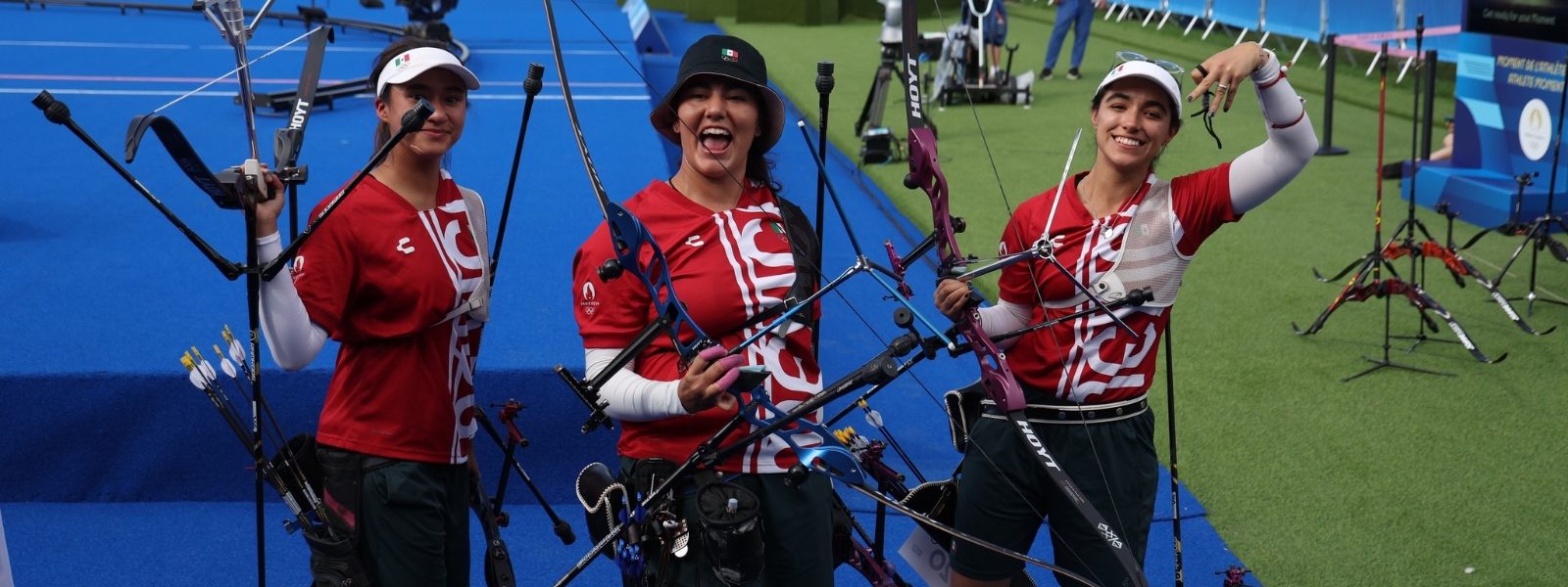 29 Julio 2024; Saltillo, Coahuila.- Las coahuilenses, Ana Paula Vázquez y Ángela Ruiz, junto a su compañera, la sonorense Alejandra Valencia, ganaron la medalla de bronce en tiro con arco por equipos femenil en los Juegos Olímpicos de París 2024.