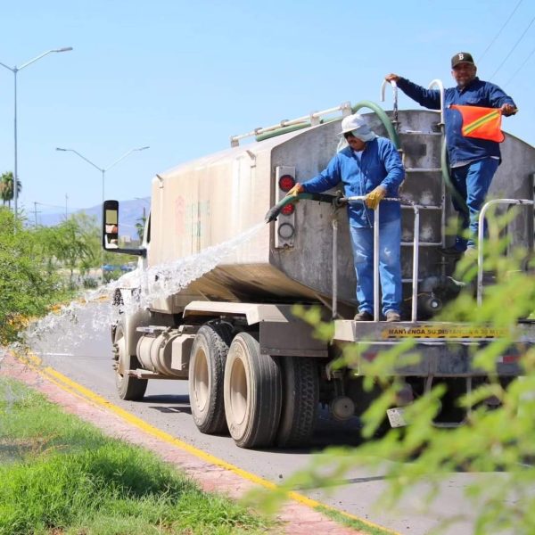 Fernando Villarreal Cuéllar, titular de la dependencia, explicó que esta labor se hace con el apoyo de seis pipas que recorren diversas plazas y avenidas que no cuentan con sistema de riego.