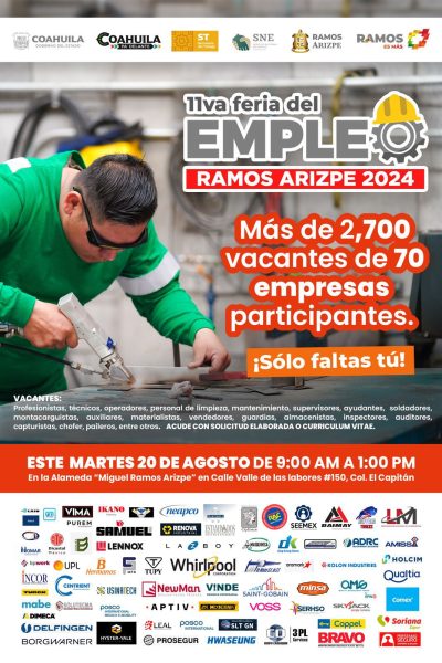 El Gobierno Municipal de Ramos Arizpe reiteró la invitación a la ciudadanía para que acuda, este martes 20 de agosto, a la decimoprimera Feria del Empleo “Solo faltas tú” a realizar en la Alameda Principal – a un costado de Dinolandia- en la que se contará con la participación de más de 70 empresas de las diversas ramas de la industria.