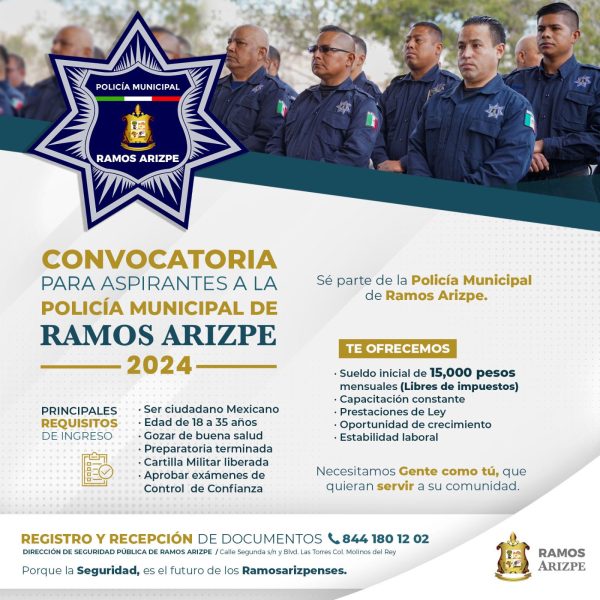 La corporación policial ramosarizpense ofrece un sueldo inicial de 15 mil pesos mensuales, libres de impuestos, prestaciones y capacitación continua.