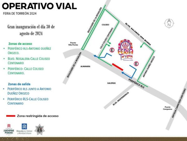 21 Agosto 2024; Torreón, Coahuila.- Para la edición 2024 de la Feria de Torreón, y debido a los trabajos de construcción que se realizan por la obra del Giro Independencia, el Municipio, a través de la Dirección de Vialidad y Movilidad Urbana, diseñó una estrategia de rutas alternas para los accesos y salidas al recinto, con la finalidad de dar fluidez al tráfico.