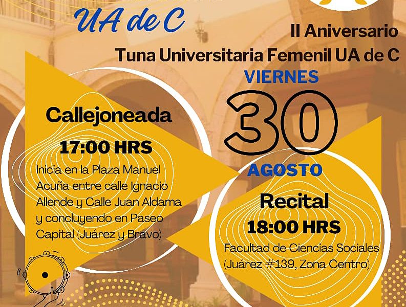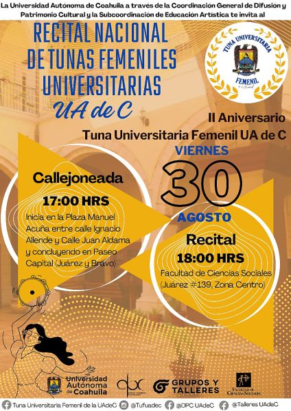 Posteriormente a las 18:00 horas, las actividades continuarán con el Recital en la Facultad de Ciencias Sociales, ubicada en la calle Benito Juárez #139 en el Centro Histórico de Saltillo; este evento contará con la participación de destacadas agrupaciones universitarias como la Tuna Femenil de la Universidad Autónoma Metropolitana Iztapalapa y la Tuna Femenil de Educación Superior de la Ciudad de México.