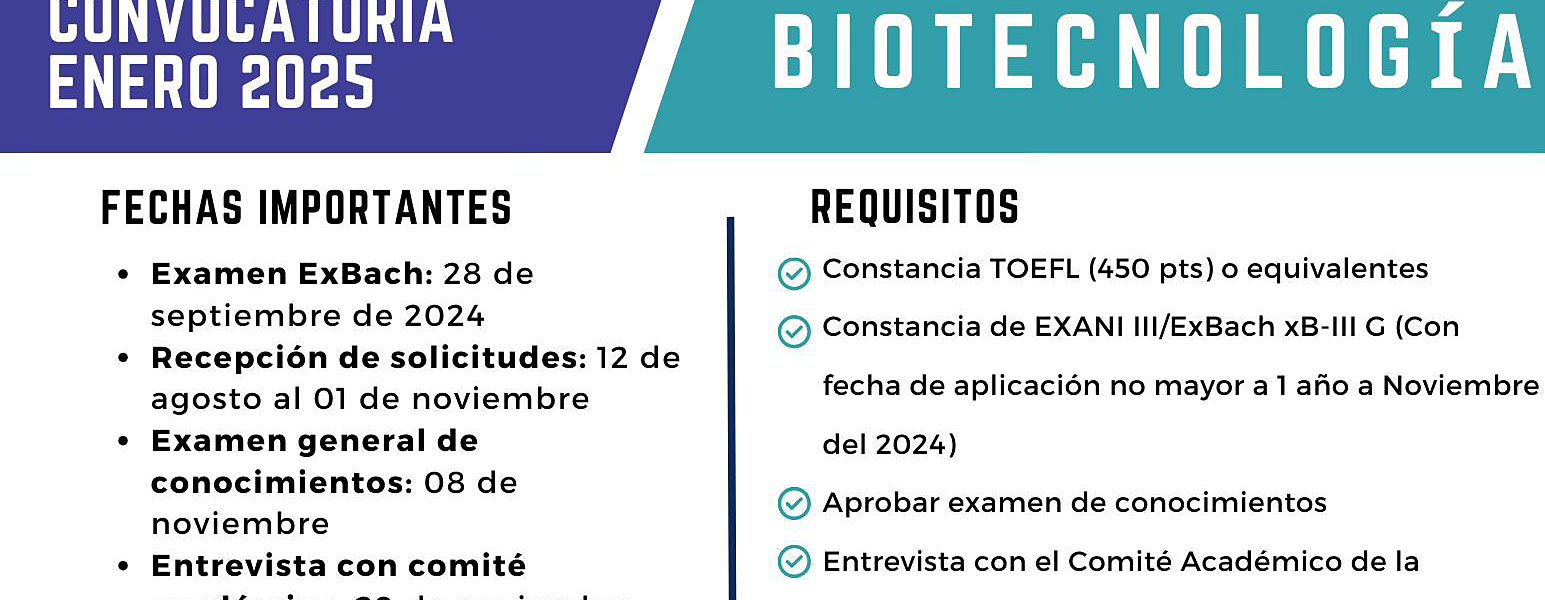 Los interesados deberán de cubrir los siguientes requisitos: constancia TOEFL de 450 puntos o equivalentes, constancia de EXANI III/ExBach xB-III G con fecha de aplicación no mayor a un año a noviembre de 2024, aprobar examen de conocimientos y entrevista con el comité académico.