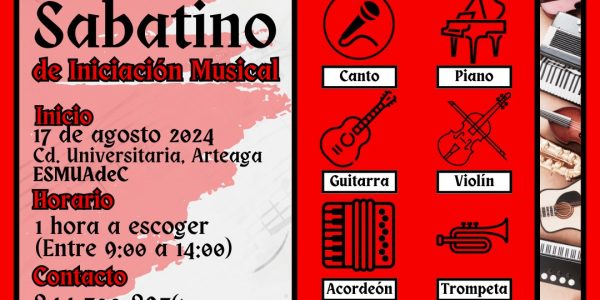 Ofrece UAdeC Cursos Sabatinos de Iniciación Musical Por Jorge Moreno 14 Agosto 2024; Arteaga, Coahuila.- La Universidad Autónoma de Coahuila a través de la Escuela Superior de Música, invita a la comunidad universitaria y público en general al Curso Sabatino…