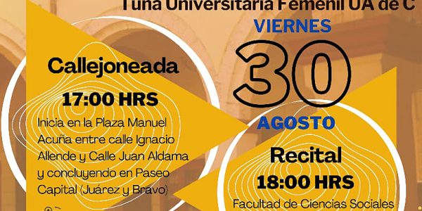 Celebrará con Recital Nacional la UAdeC el Segundo Aniversario de la Tuna Universitaria Femenil Por Jorge Moreno 23 Agosto 2024; Saltillo, Coahuila.- La Universidad Autónoma de Coahuila a través de la Coordinación General de Difusión y Patrimonio Cultural y la…