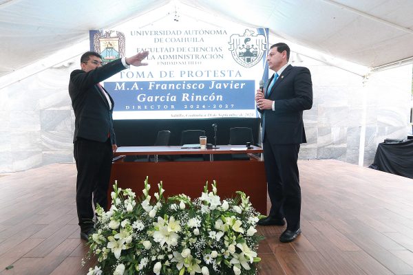 10 Septiembre 2024; Saltillo, Coahuila.- El rector de la Universidad Autónoma de Coahuila, Octavio Pimentel Martínez, tomó protesta al M.C. Francisco Javier García Rincón, como director de la Facultad de Ciencias de la Administración FCA Unidad Saltillo, para el periodo 2024-2027.