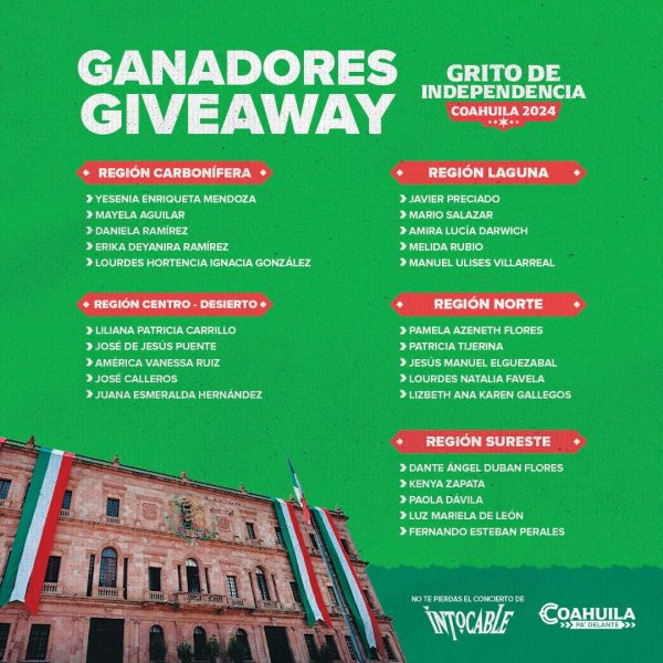 “Felicidades a las y los ganadores, quienes junto a sus acompañantes, en total 50 coahuilenses, serán nuetros invitados al interior de Palacio de Gobierno en la ceremonia del Grito de Independencia, que sin duda será el más ciudadano en la historia de Coahuila”, celebró Manolo Jiménez.
