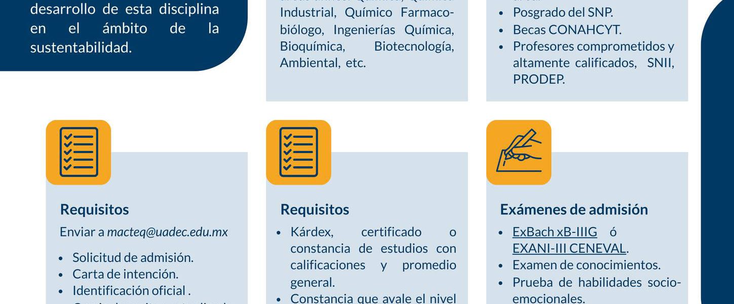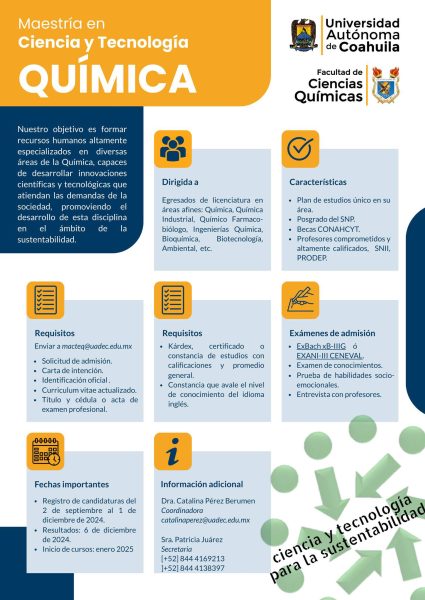 13 Septiembre 2024; Saltillo, Coahuila.- A los egresados de las licenciaturas en Química, Química Industrial, Químico Fármaco-biólogo, Ingeniería Química, Bioquímica, Biotecnología y Ambiental, la Universidad Autónoma de Coahuila a través de la Facultad de Ciencias Químicas Unidad Saltillo, les convoca a estudiar la Maestría en Ciencia y Tecnología Química.