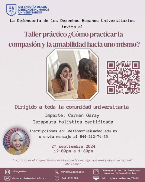 25 Septiembre 2024; Saltillo, Coahuila.- La Universidad Autónoma de Coahuila, a través de la Defensoría de los Derechos Humanos Universitarios (DDHU), invita a su comunidad universitaria participar en el Taller práctico “¿Como practicar la compasión y la amabilidad hacia uno mismo?”, el cual se llevará a cabo por la plataforma Microsoft Teams el viernes 27 de septiembre a las 12:00 horas.