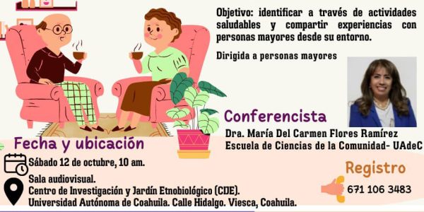 Invita UAdeC a Adultos Mayores al Taller “Charla Activa: Por un Envejecimiento Saludable” Por Alberto Casas 24 Septiembre 2024; Viesca, Coahuila.- La Universidad Autónoma de Coahuila a través del Centro de Investigación y Jardín Etnobiológico del Semidesierto de Coahuila “Dr….