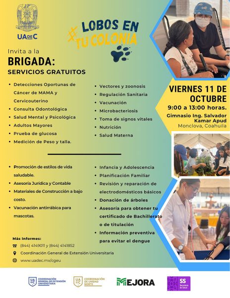 9 Octubre 2024; Monclova, Coahuila.- La Universidad Autónoma de Coahuila, invita a la comunidad universitaria de la Unidad Norte y a población en general a asistir a la Macro brigada “Lobos en tu colonia”, la cual se realizará el viernes 11 de octubre de 9:00 a 13:00 horas en el Gimnasio “Ing. Salvador Kamar Apud”, ubicado en Avenida Revolución Mexicana de la colonia Tierra y Libertad en la ciudad de Monclova.