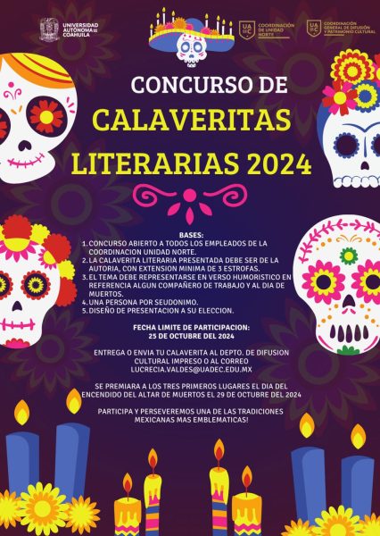 La coordinación de la Unidad Norte, invita a sus colaboradores a participar en el Concurso de Calaveritas Literarias 2024, la cual debe ser de autoría propia, con una extensión mínima de tres estrofas, el tema debe presentarse en verso humorístico en referencia a algún compañero de trabajo y del día de muertos.