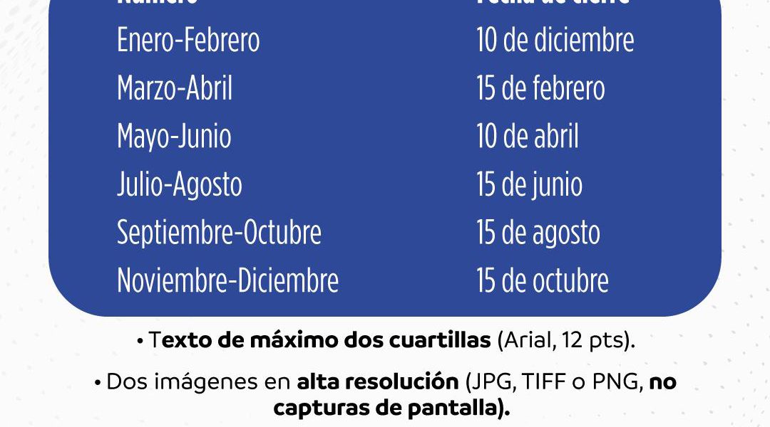 Las fechas de cierre para las ediciones son las siguientes: enero-febrero el 10 de diciembre, marzo-abril 15 de febrero, mayo-junio 10 de abril, julio-agosto 15 de junio, septiembre-octubre 15 de agosto y noviembre-diciembre 15 de octubre.
