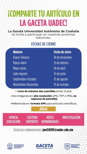 Los artículos y colaboraciones se enviarán al correo electrónico jam34509@uadec.edu.mx, para más información visitar la página http://www.uadec.mx/gaceta/ y en el Facebook Gaceta UAdeC Universidad Autónoma de Coahuila.