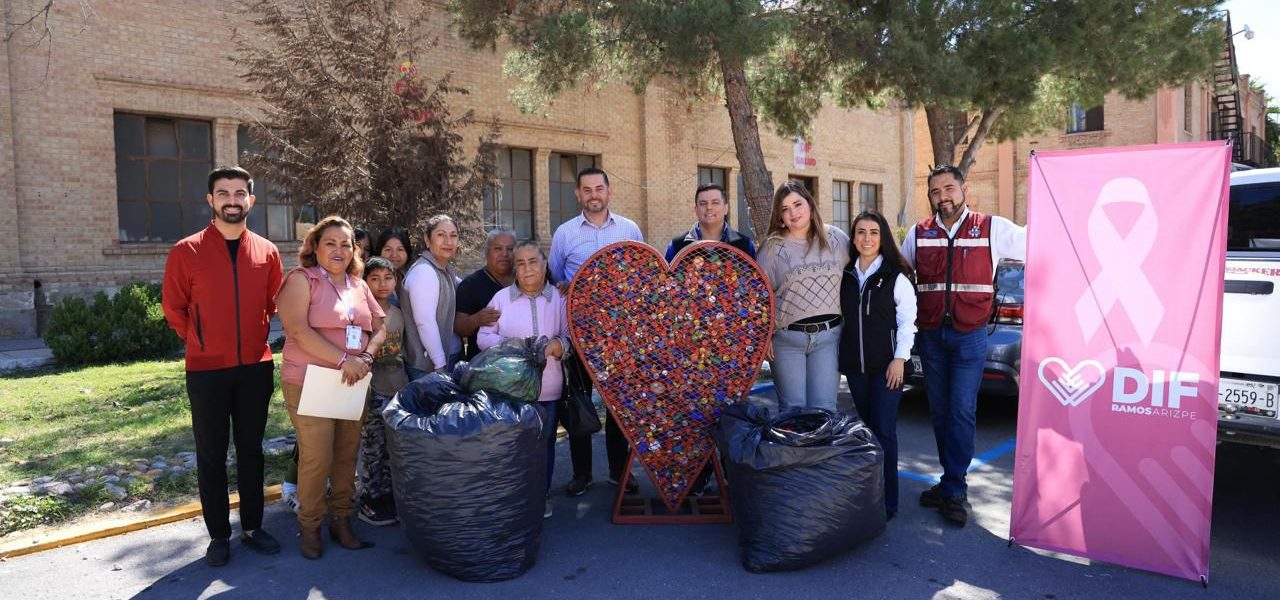 25 Octubre 2024; Ramos Arizpe, Coahuila.- En el marco de la conmemoración del Mes de la Lucha contra el Cáncer, trabajadores de la empresa Martinrea International Planta Ramos Arizpe, y alumnos del CETIS 60, del Colegio de Bachilleres de Coahuila (COBAC) en la localidad, y del Instituto La Misión donaron 100 kilos de tapas de plástico al DIF Municipal.