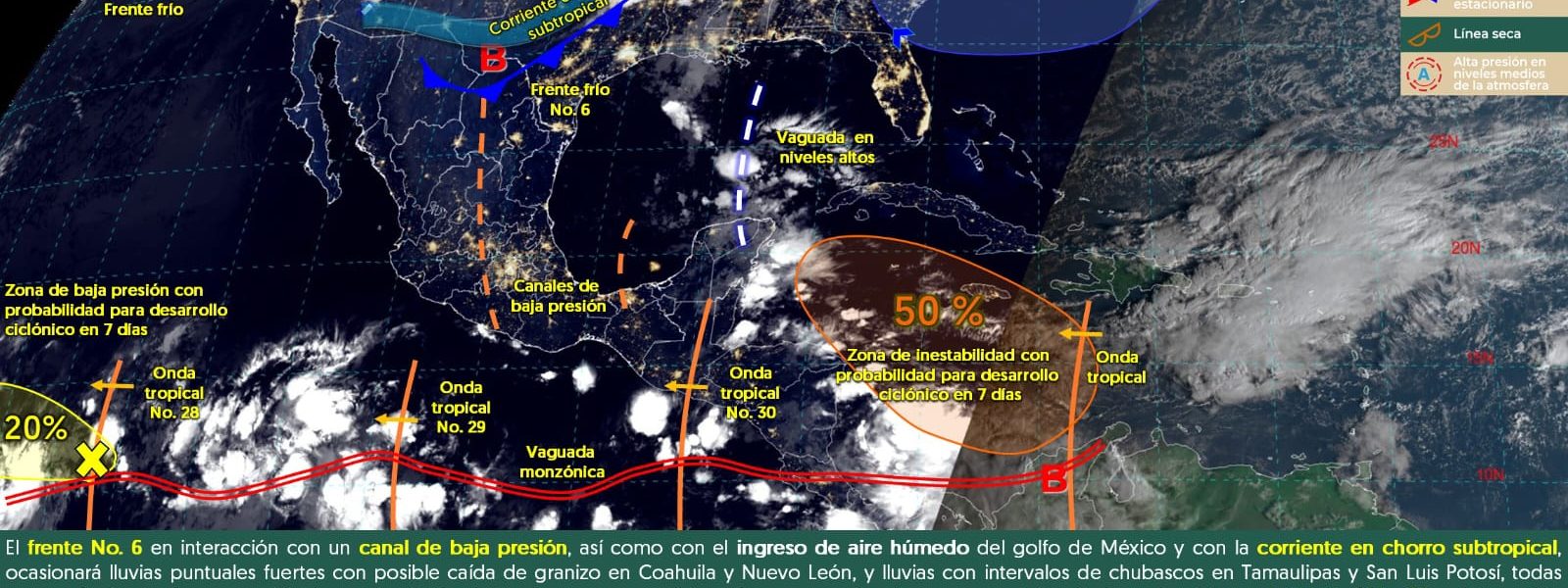Durante el fin de semana, un nuevo frente frío (N° 7) ingresará al noroeste de México, asociado a una vaguada en altura y a las corrientes en chorro polar y subtropical, lo que provocará descenso de temperatura, vientos fuertes a muy fuertes con tolvaneras, lluvias y chubascos en el noroeste y norte del país.