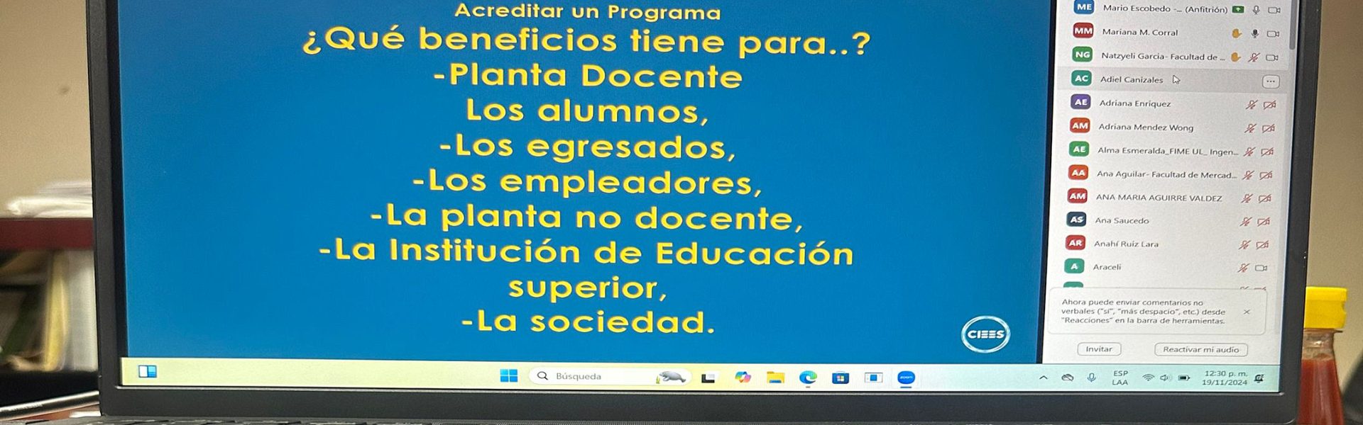 El director de Planeación, Jesús Alberto Montalvo Morales, informó que son 89 universitarios entre ellos, los tres coordinadores de Unidad, 18 directores de Unidades Académicas, 60 docentes y 8 personas de la Dirección de Planeación, quienes se capacitan, vía remota a través de la plataforma Zoom para el llenado del instrumento de evaluación, por parte del personal de los Comités Interinstitucionales para la Evaluación de la Educación Superior (CIEES).