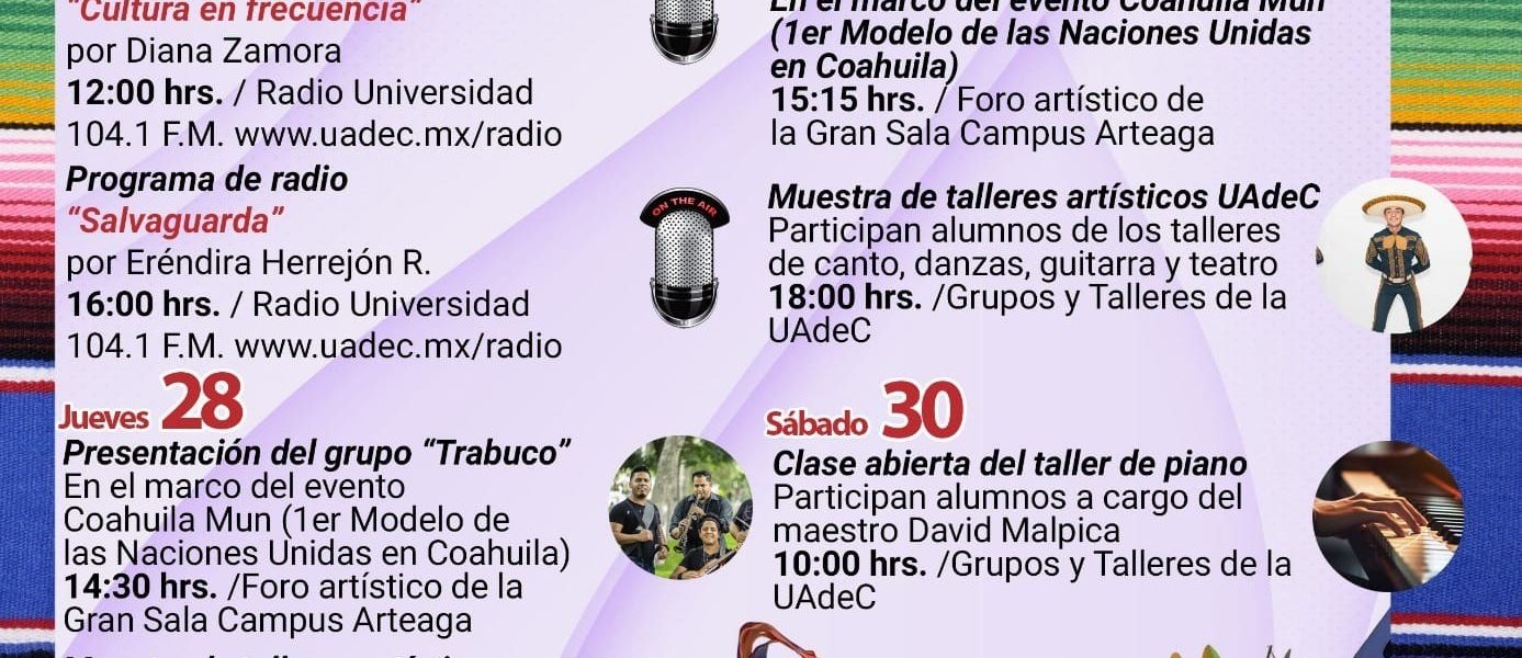 La cartelera incluye el próximo jueves 28 de noviembre la presentación del grupo Trabuco, en el marco del evento Coahuila Mun (Primer Modelo de las Naciones Unidas de Coahuila a las 14:00 horas en el foro artístico de la Gran Sala Campus Arteaga.