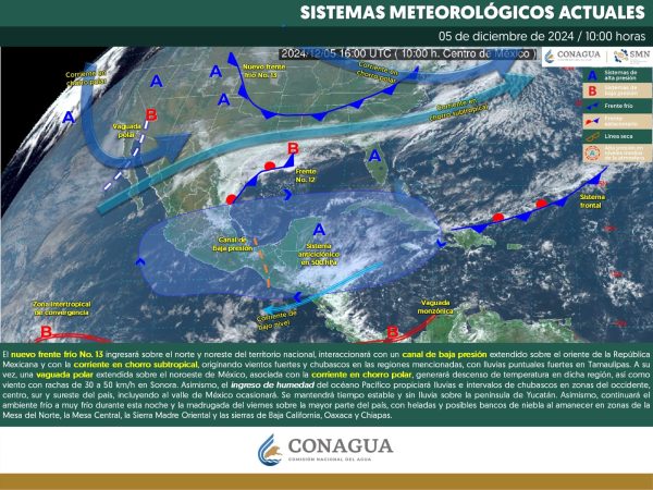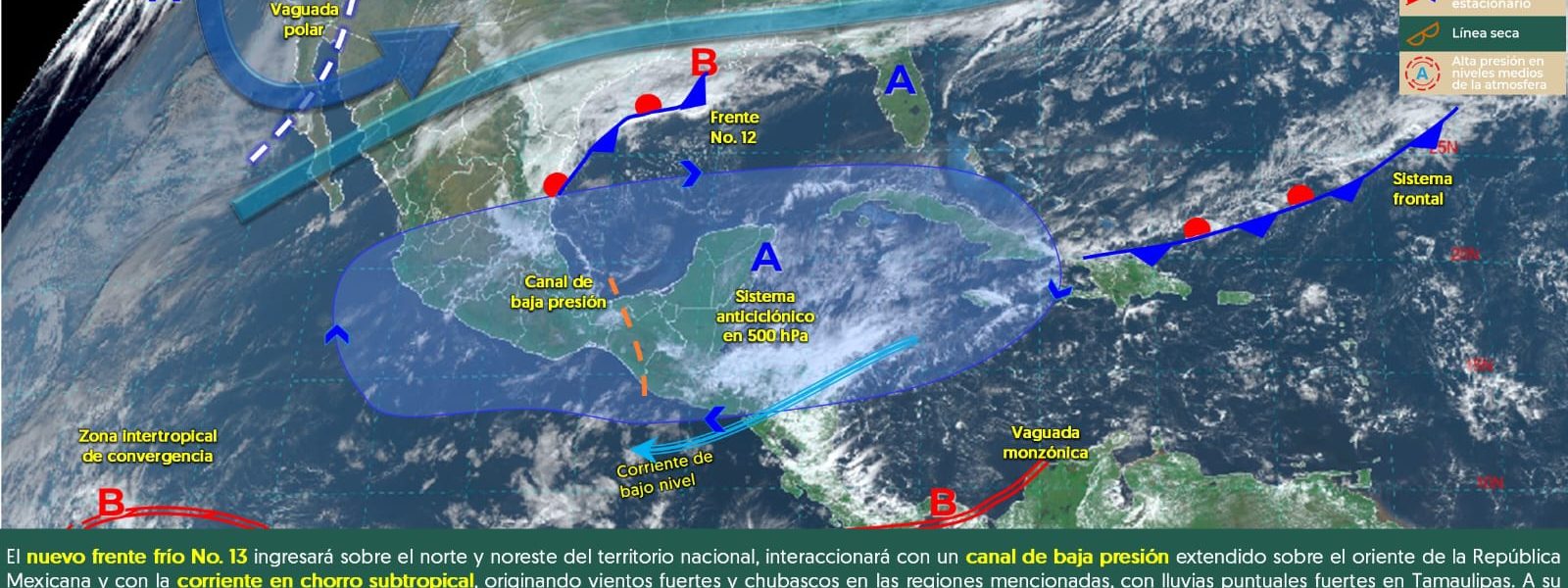 SE ESPERAN CHUBASCOS, VIENTOS FUERTES Y TEMPERATURAS BAJAS ANTE EL FRENTE FRÍO NÚMERO 13