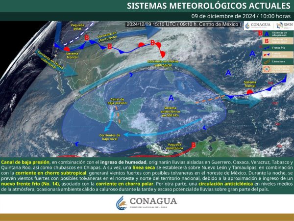 9 Diciembre 2024; Saltillo, Coahuila.- La Subsecretaría de Protección Civil del Estado informa que un nuevo Frente Frío (número 14) ingresará durante la noche sobre el norte de Coahuila, asociado con la corriente en chorro polar, propiciando vientos de 40 a 60 km/h, así como un descenso de la temperatura.