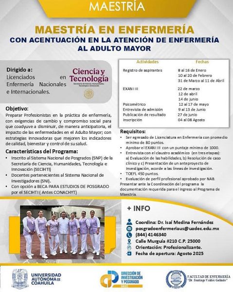 Para más información comunicarse con el coordinador de la Maestría, el Dr. Isaí Median Fernández en el correo electrónico posgradoenfermeriaus@uadec.edu.mx, vía telefónica al (844) 414 63 40 o acudir a las instalaciones de la Facultad ubicada en Calzada Francisco I. Madero #1237 en la Zona Centro de Saltillo.