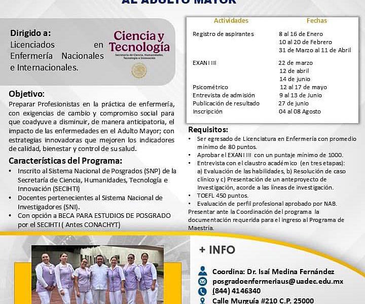 15 Enero 2025; Saltillo, Coahuila.- La Universidad Autónoma de Coahuila a través de la Facultad de Enfermería “Santiago Valdés Galindo” ofrece la Maestría en Enfermería con Acentuación en Atención de Enfermería al Adulto Mayor, dirigida a Licenciados en Enfermería nacionales e internacionales.