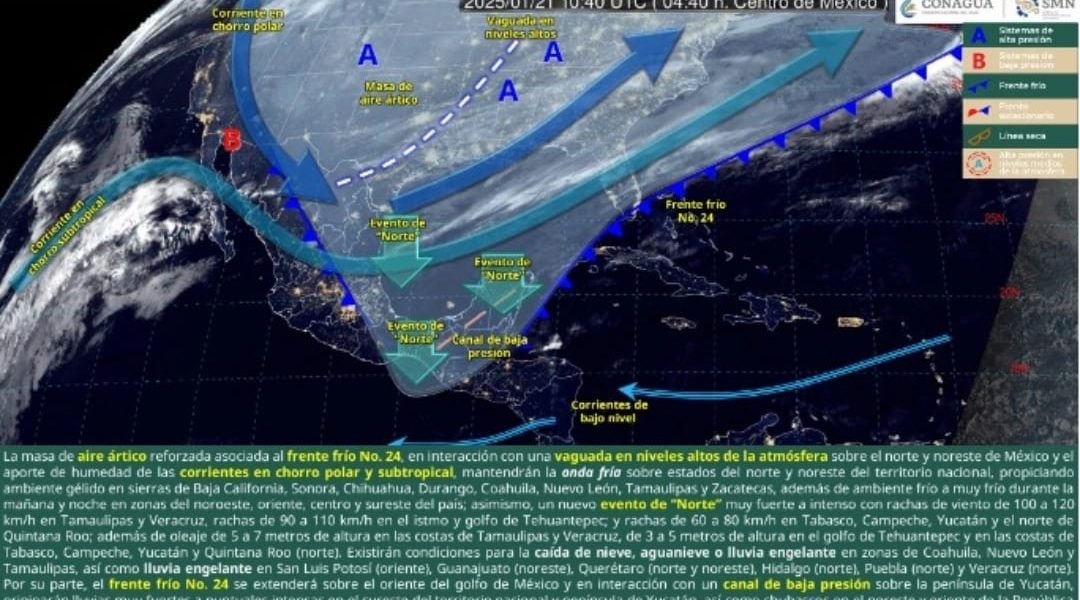 21 Enero 2025; Saltillo, Coahuila.- La Subsecretaría de Protección Civil del Estado informa que el frente frío No. 24, junto con una corriente de aire frío y humedad en la atmósfera, seguirá afectando a Coahuila, manteniendo temperaturas bajas en gran parte del estado.
