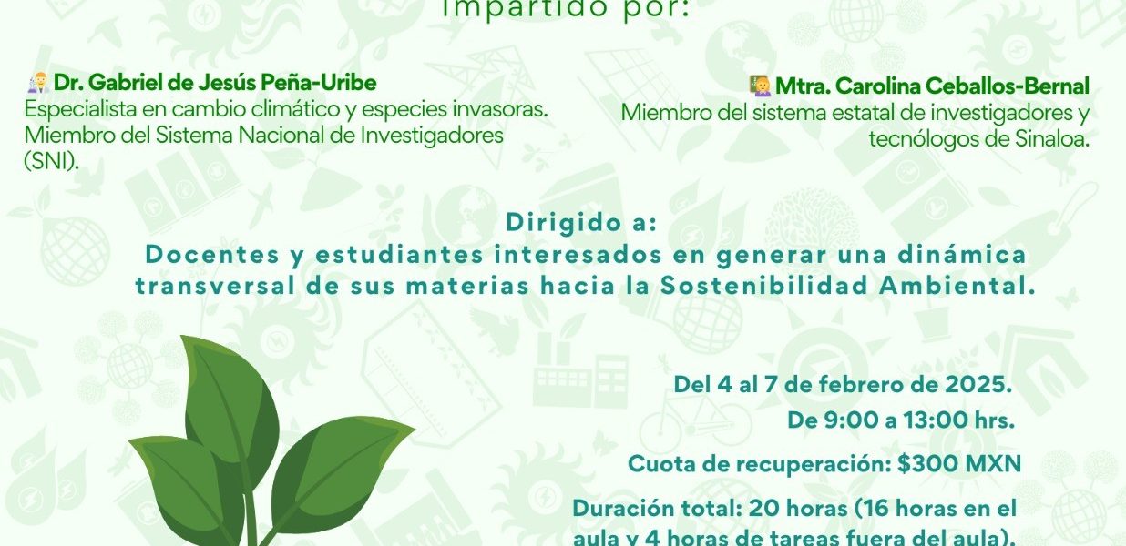 Cabe mencionar que, el curso-taller será impartido por el Dr. Gabriel de Jesús Peña-Uribe, Biólogo Marino por la Universidad Autónoma de Baja California Sur, quien además pertenece al Sistema Nacional de Investigadores nivel candidato, así como por la Mtra. Carolina Ceballos Bernal, ingeniera bioquímica con especialidad Ambiental egresada del Instituto Tecnológico de Mazatlán, quien actualmente labora en el Departamento de Educación Ambiental del Centro de Investigación en Alimentación y Desarrollo de Educación Ambiental del Centro de Investigación en Alimentación y Desarrollo, A.C. (Centro de Investigación CONAHCYT).