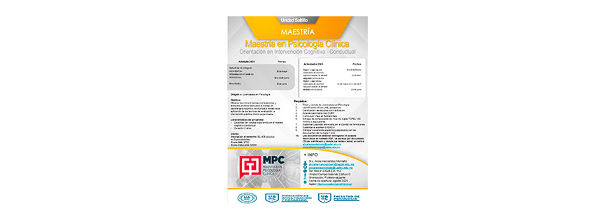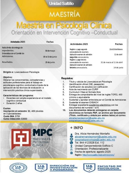 7 Febrero 2025; Saltillo, Coahuila.- La Universidad Autónoma de Coahuila a través de la Facultad de Psicología Unidad Sureste, convoca a estudiar la Maestría en Psicología Clínica con Orientación en Intervención Cognitivo -Conductual, que tiene una duración de dos años y cuyas clases inician en agosto 2025.