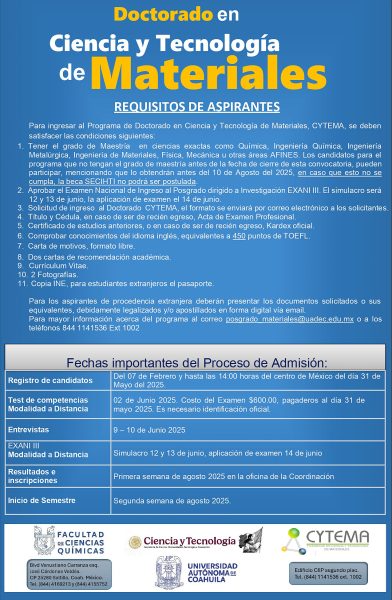14 Febrero 2025; Saltillo, Coahuila.- La Universidad Autónoma de Coahuila, a través de la Facultad de Ciencias Químicas (FCQ), convoca a profesionistas con grado de Maestría en áreas afines como Ingeniería Química, Ingeniería Metalúrgica, Física y Mecánica a registrarse para cursar el Doctorado en Ciencia y Tecnología de Materiales (CYTEMA) para el semestre agosto-diciembre 2025 en la página www.admisiones.uadec.mx.
