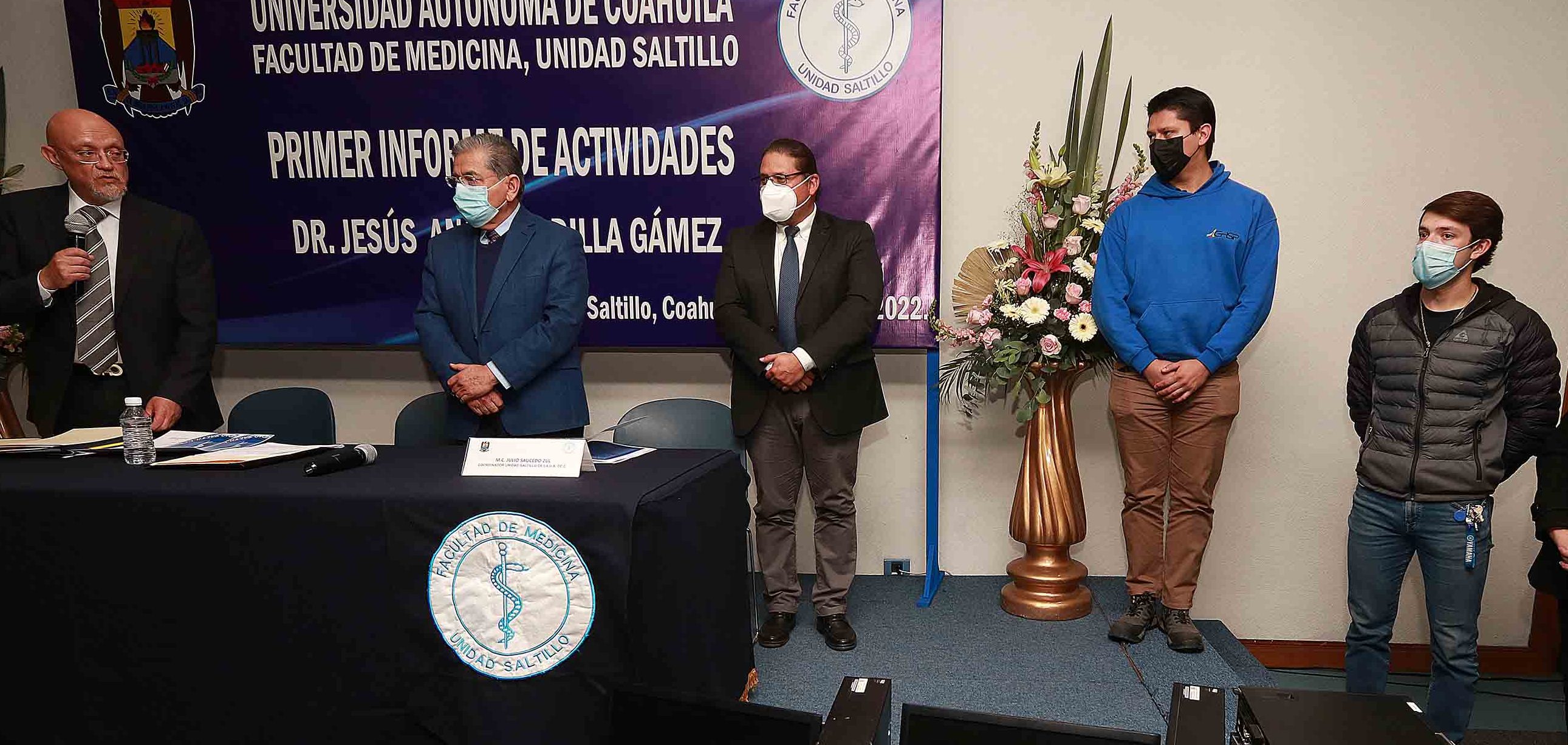 En el Auditorio de la Facultad de Ciencias Químicas, el Rector estuvo acompañado por el director de Investigación y Posgrado, Luis Gutiérrez Flores, la coordinadora general de Vinculación e Innovación Productiva, Karla Patricia Valdés García, la coordinadora general de Relaciones Internacionales, Lourdes Morales Oyervides y el director del plantel, Leopoldo Ríos González.