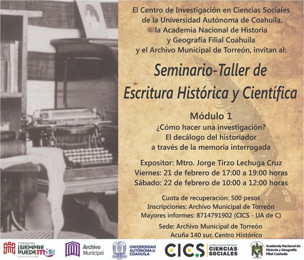 19 Febrero 2025; Torreón, Coahuila.- La Universidad Autónoma de Coahuila, a través del Centro de Investigación en Ciencias Sociales (CICS) Unidad Laguna y en colaboración con la Academia de Historia y Geografía Filial Coahuila y el Archivo Municipal de Torreón, invitan al Seminario-Taller de Escritura Histórica y Científica, el cual se realizará del viernes 21 de febrero al sábado 8 de marzo de 2025.