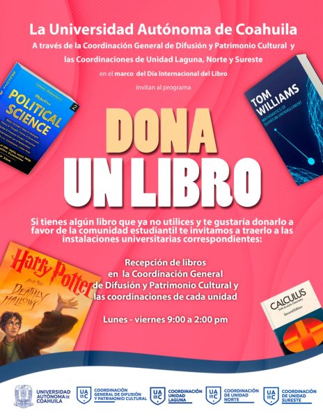 10 Marzo 2025; Saltillo, Coahuila.- Rumbo a la celebración del Día Internacional del Libro, que será el 23 de abril, la Universidad Autónoma de Coahuila, a través de la Coordinación de Difusión y Patrimonio Cultural, convoca a la comunidad universitaria y público en general a donar un libro.