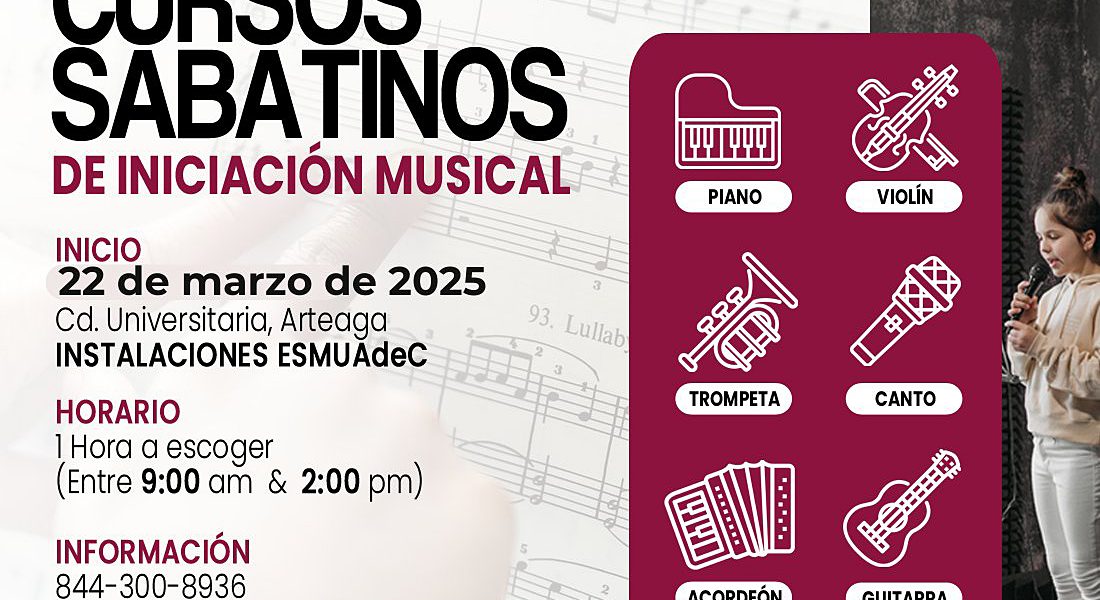 20 Marzo 2025; Arteaga, Coahuila.- A partir del 22 de marzo inician los cursos sabatinos de iniciación musical que ofrece la Universidad Autónoma de Coahuila a través de la Escuela Superior de Música, para aprender sobre canto, guitarra, violín, piano, trompeta, acordeón, ukelele, bajo y guitarra eléctrica.