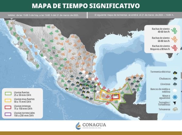 Asimismo, se prevén temperaturas mínimas de -5 a 0 °C con heladas durante la madrugada del viernes 21 de marzo, especialmente en zonas montañosas del estado.