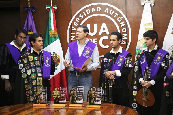 Por su parte, los integrantes de la Tuna agradecieron el respaldo de la UAdeC para la realización del viaje y, como muestra de gratitud y reconocimiento al Rector, le otorgaron su Beca, el tradicional paño morado en forma de «V» que simboliza la identidad de la agrupación, con lo que Pimentel Martínez fue nombrado “Tuno Honoris”.