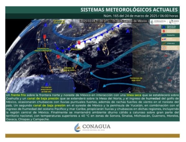 Asimismo, el paso de este sistema frontal generará descargas eléctricas y vientos con rachas de entre 30 y 50 km/h en diversas zonas del estado.