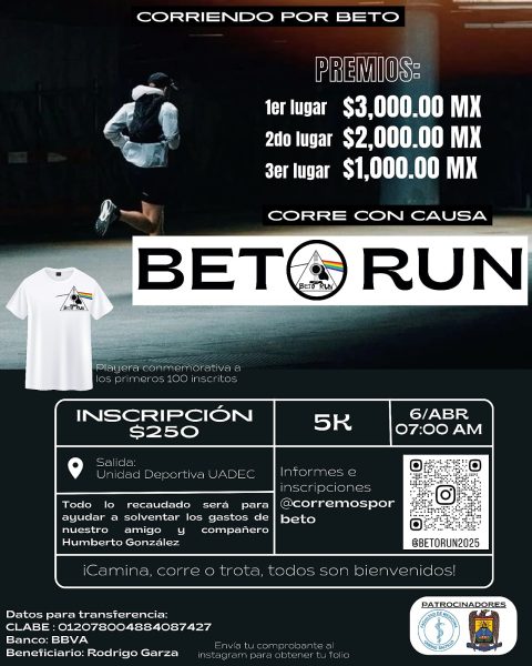 28 Marzo 2025; Saltillo, Coahuila.- Como una muestra de solidaridad y empatía, alumnos y alumnas de la Facultad de Medicina de la Universidad Autónoma de Coahuila, Unidad Sureste, convocan a la comunidad universitaria y población en general a participar en la carrera con causa, “Beto- Run 5K”, a favor de la familia de su compañero Humberto González, quien recientemente perdió la batalla contra el cáncer, y es para pagar los gastos hospitalarios que ascienden en más de 300 mil pesos.