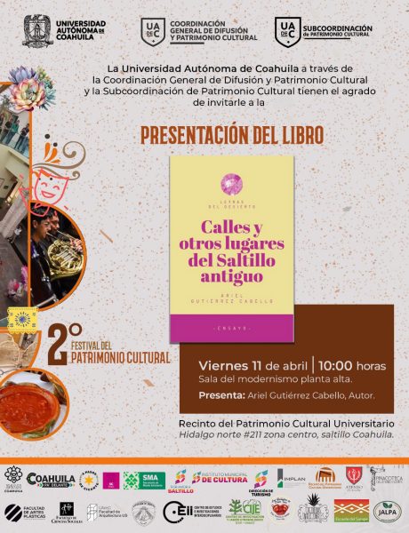 Este viernes se llevará a cabo la presentación del libro “Calles y otros lugares del Saltillo antiguo” de Ariel Gutiérrez Cabello, a las 11:00 horas la presentación artística 12:00 horas la plática “Plantas medicinales de Viesca y la Región”, 13:30 horas presentación Atlas del Patrimonio del IMPLAN, 14:00 horas clausura y la presentación del Libro del Dr. Carlos Manuel Dávila en la Galería de la Facultad de Ciencias Sociales.